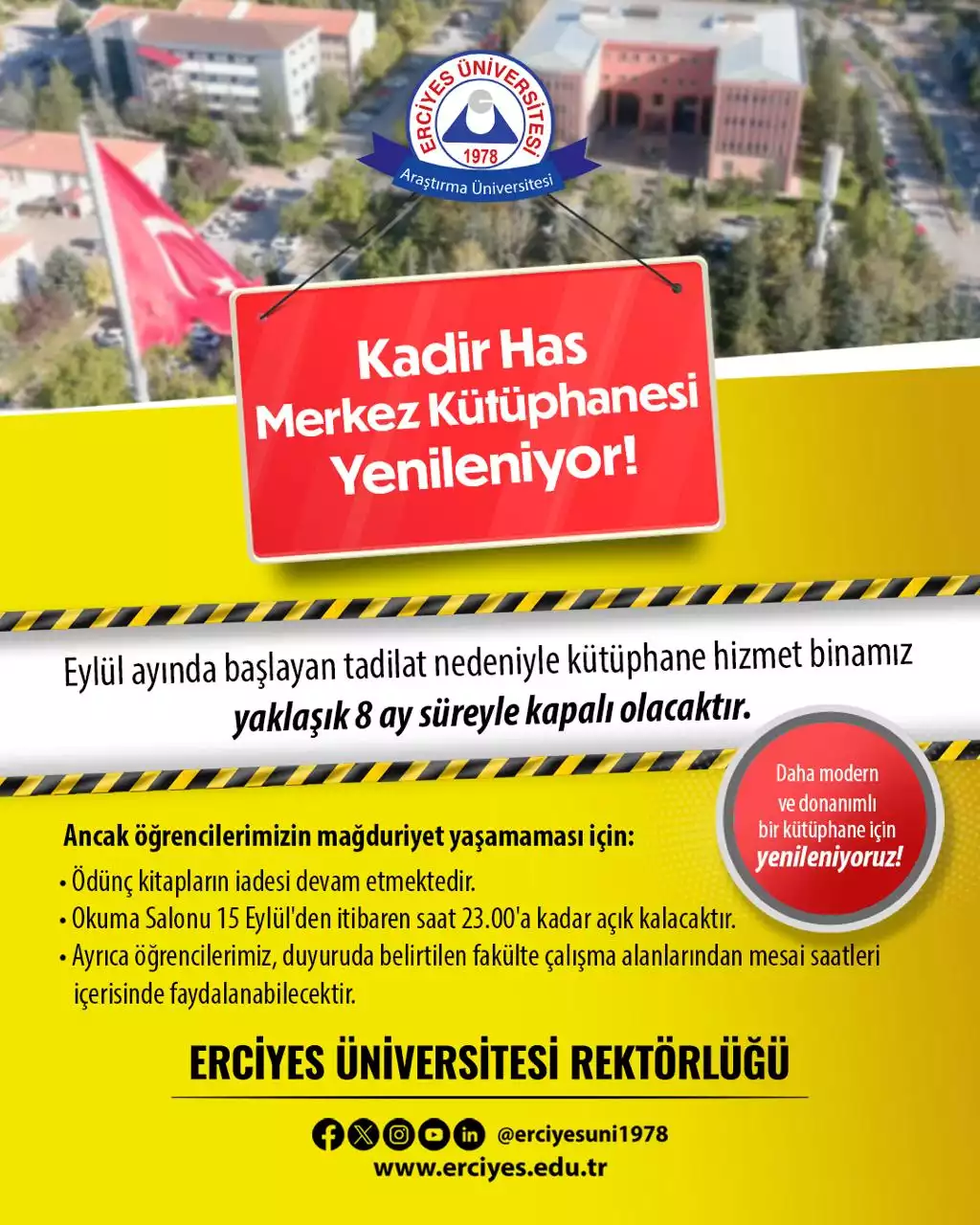 Bu kapsamda, 01 Eylül 2025 Pazartesi günü itibarıyla Kadir Has Merkez Kütüphanesi hizmet binası geçici olarak hizmete kapatılmıştır. Tadilat süreci boyunca Kütüphane ödünç verme hizmetleri geçici olarak durdurulmuştur. Tadilat süreci boyunca aşağıda yer alan hizmetler kesintisiz olarak devam edecektir.